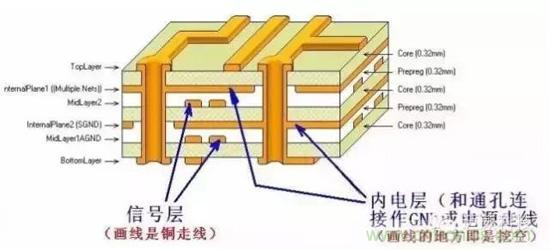 通常簡稱為內(nèi)電層,僅在多層板中出現(xiàn),PCB板層數(shù)一般是指信號層和內(nèi)電層相加的總和數(shù)。與信號層相同,內(nèi)電層與內(nèi)電層之間、內(nèi)電層與信號層之間可通過通孔、盲孔和埋孔實現(xiàn)互相連接。