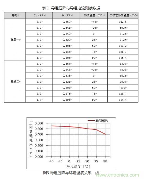 在我們開發(fā)產(chǎn)品的過程中,高低溫環(huán)境對電子元器件的影響才是產(chǎn)品穩(wěn)定工作的最大障礙。環(huán)境溫度對絕大部分電子元器件的影響無疑是巨大的,二極管當(dāng)然也不例外,在高低溫環(huán)境下通過對SM360A的實測數(shù)據(jù)表1與圖3的關(guān)系曲線可知道:二極管的導(dǎo)通壓降與環(huán)境溫度成反比。在環(huán)境溫度為-45℃時雖導(dǎo)通壓降最大,卻不影響二極管的穩(wěn)定性,但在環(huán)境溫度為75℃時,外殼溫度卻已超過了數(shù)據(jù)手冊給出的125℃,則該二極管在75℃時就必須降額使用。這也是為什么