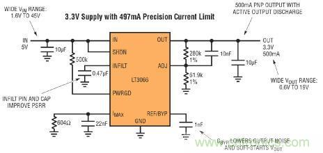 3.3V Supply with 497mA Precision Current Limit:具 497mA 精準(zhǔn)電流限制的 3.3V 電源