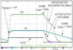圖 2:具備主動(dòng)輸出放電功能的 LT3066 與 LT3065 的比較
