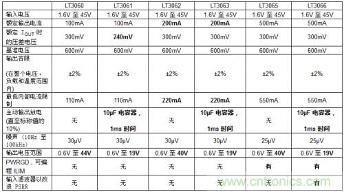表 1:LT306x 系列 LDO 功能和特點(diǎn)一覽