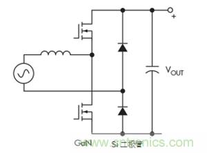 一種替代方案是連續(xù)導通模式圖騰柱拓撲。這種拓撲結(jié)構(gòu)充分利用了GaN的所有關(guān)鍵特性,最終導致尺寸更小、工作頻率更高的設計(圖4)。GaN的零反向恢復對于實現(xiàn)該拓撲特別重要。