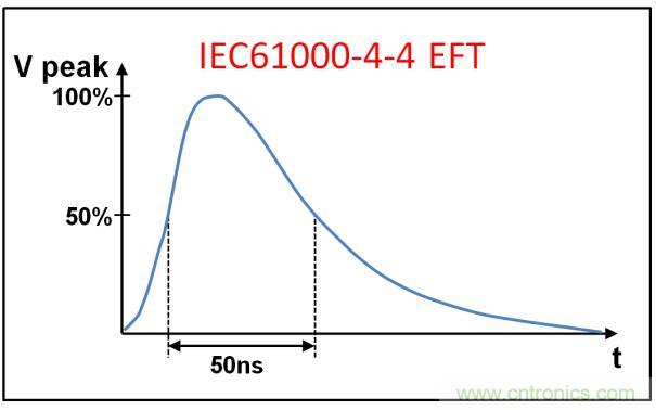 電快速瞬變(EFT)測試的是,將大量極快的瞬變脈沖耦合到信號線上,系統(tǒng)與外部開關(guān)電路關(guān)聯(lián)的瞬變干擾,這類電路能夠以容性方式耦合至通信端口。EFT的纏上包括繼電器和開關(guān)觸點抖動,或者因為感性或容性負載切換而產(chǎn)生的瞬變, 而所有這些在工業(yè)環(huán)境中都很常見。EC 61000-4-4中定義的 EFT測試,就是去模擬這些事件產(chǎn)生的干擾。