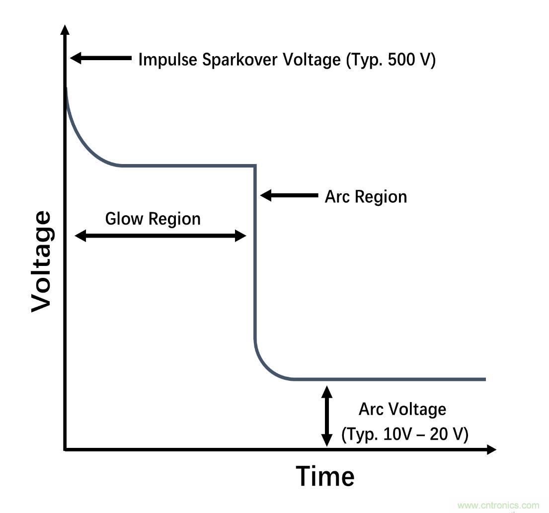 GDT主要用作主保護器件,提供低阻抗接地路徑以防止過壓瞬變。當瞬變電壓達到GDT火花放電電壓時,GDT將從高阻抗關(guān)閉狀態(tài)切換到電弧模式。在電弧模式下,GDT成為虛擬短路,提供瞬變開路電流接地泄放路徑,將瞬變沖擊電流從受保護器件上轉(zhuǎn)移開。