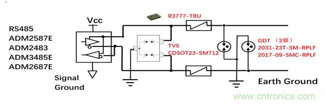在這個方案中,由TVS(CDSOT23-SM712)提供次級保護, TISP(TISP4240M3BJR-S)則提供主保護,主保護器件和次級保護器件之間的協(xié)調(diào)以及過流保護是利用Bourns專利技術(shù)的過流保護器件TBU(TBU-CA065-200-WH)實現(xiàn)的。