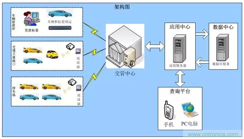 正是由于電子車牌相比傳統(tǒng)車牌有這么多的優(yōu)勢和特點,可以預(yù)見在不久的將來,機動車輛將會逐步使用帶有電子標(biāo)簽的電子車牌替代目前的傳統(tǒng)車牌,這樣一來,從車輛前端的電子車牌,到后端的車牌識別、數(shù)據(jù)傳輸、車輛管理、數(shù)據(jù)存儲、終端查詢等整個平臺的構(gòu)建和發(fā)展前景都是十分廣闊的,圖2是整個平臺組成架構(gòu)的示意圖。