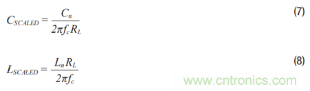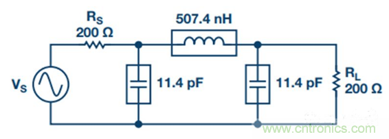 CSCALED為最終電容值。LSCALED為最終電感值。Cn為低通原型電容元件值。Ln為低通原型電感元件值。RL為最終負(fù)載電阻值。fc 為最終截止頻率。C1SCALED = 1.433/(2π × 100 × 106 × 200) = 11.4 pFL2SCALED = (1.594 × 200)/(2π × 100 × 106) = 507.4 nHC3SCALED = 11.4 pF