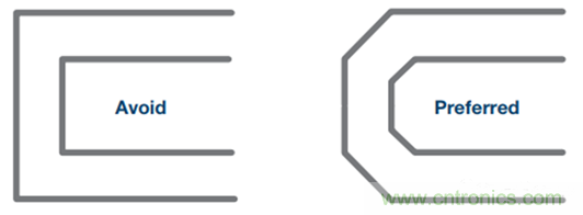 差分對(duì)布線時(shí),應(yīng)避免急轉(zhuǎn)彎(90°)(參見圖23)。