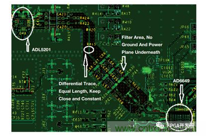 ADI公司接收器參考設(shè)計(jì)板(參見圖26)提供了差分濾波器PCB布局 的一個(gè)示例。這顯示了ADL5201和AD6649之間有一個(gè)五階濾波 器。AD6649是一款14位250 MHz流水線式ADC,具有非常好的SNR 性能。