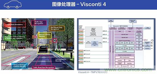 東芝圖像識(shí)別處理器可并行運(yùn)行多個(gè)圖像識(shí)別應(yīng)用,并支持用于夜間行人識(shí)別的可靠系統(tǒng)解決方案。Visconti 4已經(jīng)是第四代圖像識(shí)別處理器芯片,與前一代產(chǎn)品相比,處理速度進(jìn)一步提高,它采用八核異構(gòu)架構(gòu),與前一代產(chǎn)品相比,處理時(shí)間縮短一半,識(shí)別時(shí)間縮短一半,可以降到50毫秒以內(nèi)。