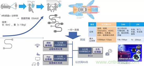 他表示隨著自動(dòng)駕駛和車聯(lián)網(wǎng)的發(fā)展,汽車搭載越來越多的傳感器和越來越多的攝像頭。這帶來的挑戰(zhàn)就是數(shù)據(jù)傳輸需求越來越高。為了提升數(shù)據(jù)傳輸,車內(nèi)線纜會(huì)長達(dá)到幾公里重達(dá)幾十公斤,為了簡化連接,汽車行業(yè)推出了新的車專用以太網(wǎng),它可與現(xiàn)有的車載用車身數(shù)據(jù)通訊系統(tǒng)通信,所以激發(fā)了車載以太網(wǎng)橋接芯片的需求。