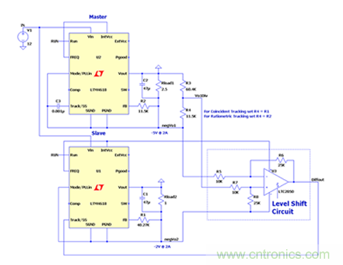 TRACK引腳輸入允許μModule穩(wěn)壓器通過將跟蹤信號(即,主μModule穩(wěn)壓器的輸出電壓軌的分壓版本)提供給從μModule穩(wěn)壓器的TRACK引腳來跟蹤另一電源軌的輸出電壓斜坡。每個μModule穩(wěn)壓器內(nèi)部控制器所看到的TRACK引腳電壓與其μModuleGND引腳相關(guān),但在需要配置兩個負輸出轉(zhuǎn)換器進行跟蹤的應(yīng)用中,μModule穩(wěn)壓器的GND引腳可以處于不同的電位。主和從GND引腳電位差異意味著主設(shè)備提供的跟蹤信號不能直接施加到從設(shè)備的跟蹤引腳。在這些類型的應(yīng)用中,需要額外的考慮以確保從機相位能夠看到來自主機相位的正確參考的跟蹤信號。