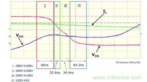 LLC串聯(lián)諧振電路MOSFET的Vds放電過程分為四個階段,如下圖所示, (I) 380V-300V; (II) 300V-200V; (III) 200V-100V; (IV)100V-0V。