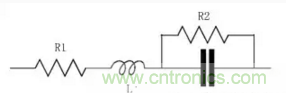 導(dǎo)線在圓導(dǎo)體柱上繞制而成,因此電感除了考慮本身的感性特征,還需要考慮導(dǎo)線的電阻以及相鄰線圈之間的分布電容。電感的等效電路模型如下圖所示,寄生旁路電容C和串聯(lián)電阻R分別由分布電容和電阻帶來的綜合效應(yīng)。