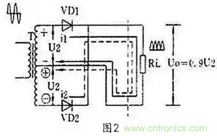全波整流則是要用到二個(gè)二極管,ASEMI工程上也會(huì)要求需要有帶中心抽頭的兩個(gè)次級(jí)線圈,這兩個(gè)次級(jí)線圈需要圈數(shù)相同,以保證相同的電阻。詳細(xì)的情況我們可以看下圖2,負(fù)載RL得到的就是全波整流電流,輸出電壓比半波整流電路要高。