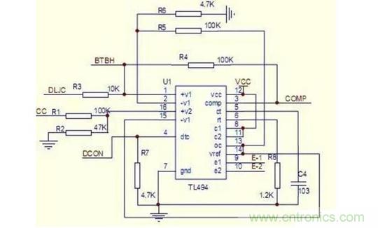 最后由TL494CN芯片的5腳外接點(diǎn)容C3和6腳外接電阻R15決定脈寬頻率為F=1.1÷(0.1×220)KHZ=50HZ控制Q10、Q11、Q13、Q14工作在50HZ的頻率下,將220V直流電逆變?yōu)?20V/50HZ的交流電,上圖將完成這部分功能。