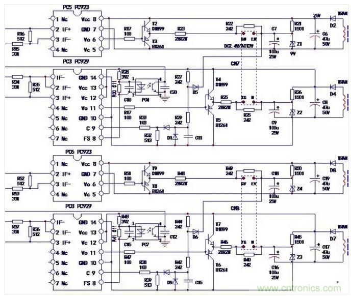 如圖2-9所示,PC5與PC6兩路驅動IC的外圍電路的元件參數(shù)完全相同;PC3與PC8兩路驅動IC的外圍元件參數(shù)完全相同,R17=R51、R23=R48、R22=R49……,當PC3外圍有元件損壞壞,可以“照搬”PC5相對應外圍元件的參數(shù)值進行修復。