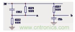 如下圖6所示電路中,測量a點電壓正常值應為R221、R22對3V供電的分壓值1.5V,若測量電壓值高于1.5V,可能系電容C112漏電損壞所致;測b點電壓正常值應為3V,若低于3V,可能系電容C56漏電損壞所致。