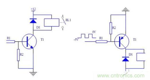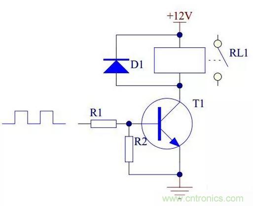電路中各元器件的作用:晶體管T1為控制開關;電阻R1主要起限流作用,降低晶體管T1功耗;電阻R2使晶體管T1可靠截止;二極管D1反向續(xù)流,為三極管由導通轉(zhuǎn)向關斷時為繼電器線圈中的提供泄放通路,并將其電壓箝位在+12V上。