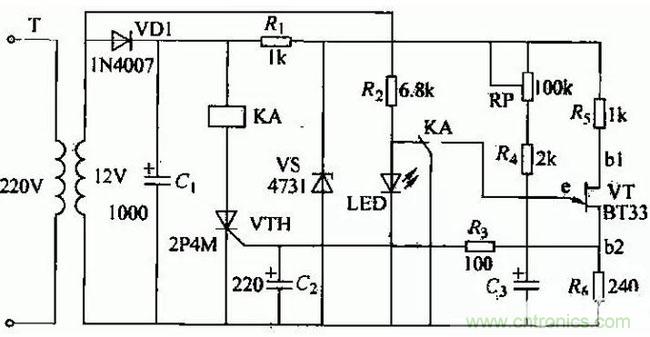 電容G上電壓按指數(shù)規(guī)律逐漸升高,當此電壓大于單結(jié)晶體管VT的峰點電壓時,單結(jié)晶體管導(dǎo)通,G經(jīng)VT的eb1極和風放電,在風上輸出脈沖電壓,觸發(fā)藩閘管VTH導(dǎo)通使繼電器KA吸合,KA的觸頭同時將C3短路,使之迅速放電,單結(jié)晶體管的ebl之間電壓迅速下降,當降到Vr.的谷點電壓時,Vr關(guān)閉。同時LED指示燈點亮。當切斷電源時,繼電器KA釋放,電路恢復(fù)原始狀態(tài),等待下次動作。通過調(diào)節(jié)RP.可以調(diào)整延時時間。