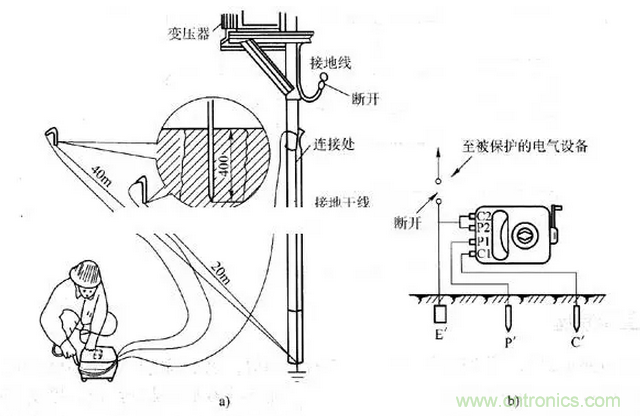 接地電阻測(cè)試使用圖解:a)實(shí)際操作 b)等效原理
