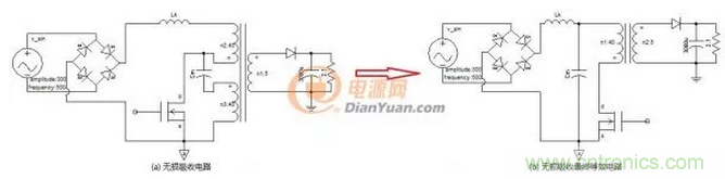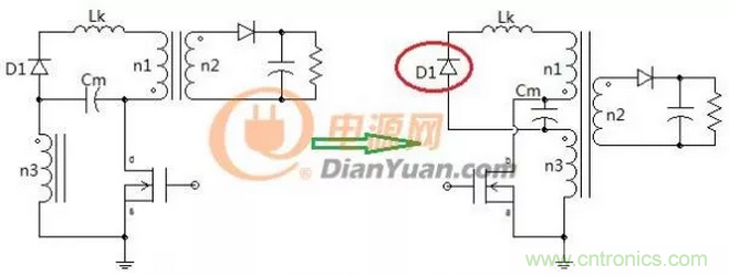 有一篇叫做“反激變換器繞組鉗位電路的設(shè)計(jì)與分析”的文章與這里的電路非常的相似。那個(gè)電路所具有的優(yōu)點(diǎn)也是這個(gè)電路的優(yōu)點(diǎn),從而驗(yàn)證了之前的理論和仿真結(jié)果。不過這里的電路有著更優(yōu)異的特點(diǎn),見下面兩個(gè)電路對(duì)比圖: