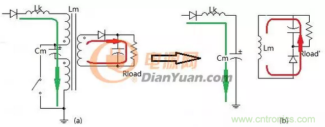 見圖4-1-2中的(b)等效電路,在開關(guān)關(guān)斷期間輸入和輸出可視為兩個(gè)獨(dú)立的電路,輸入側(cè)漏感Lk的能量被電容Cm吸收,輸出側(cè)電感Lm對(duì)負(fù)載釋放能量。