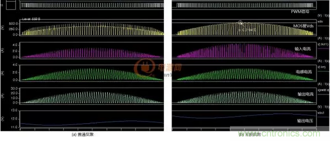 圖4-3-2:普通反激PFC與無損吸收PFC波形對(duì)比