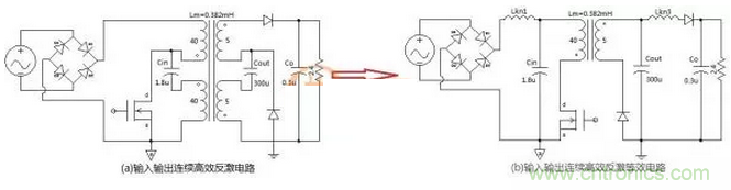 兩個(gè)電路的區(qū)別就在于二極管的接法略有不同,圖(b)這個(gè)電路能達(dá)到更高的效率而且可以實(shí)現(xiàn)軟開關(guān)。