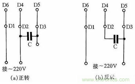 圖4是JX07A-4型單相電容運轉電動機接線方法。電動機功率為60W,用220V/50Hz交流電源、電流為0.5A。它的轉速為每分鐘1400轉。電容選用耐壓400~500V、容量8μF的產(chǎn)品。圖4(a)為正轉接線,圖4(b)為反轉接線。