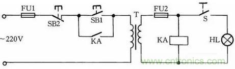 工作原理:閉合S后,按下按鈕SB1,變壓器得電輸出36V低電壓,使得繼電器或交流接觸器KA吸合。放松按鈕SB1后,KA自鎖觸點使KA保持吸合,繼續(xù)給變壓器接通電源。如果變壓器次級發(fā)生短路故障,繼電器線圈電壓為零,此時KA便失電釋放,將變壓器電源斷開,保護變壓器不被破壞。
