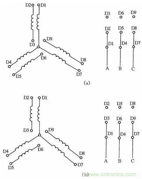 圖8所示是2Y/2Y電動機雙速定子線組的引出線接線方法。