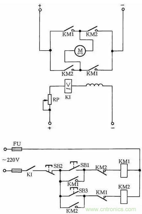在勵磁電路內,串聯(lián)一個欠電流繼電器KI,其常開觸點接在控制電路中。當勵磁電流消失或減小到設定值時,KI釋放,KI常開觸點斷開,切斷電動機電樞電源,使電動機停轉,從而避免超速現(xiàn)象發(fā)生,見圖11。