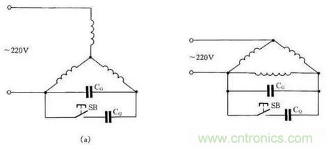 如圖19所示:圖(a)為Y形接法電動機連接方法,圖(b)為△形接法電動機連接方法。為了提高啟動轉矩,將啟動電容CQ在啟動時接入線路中,在啟動完畢后退出。