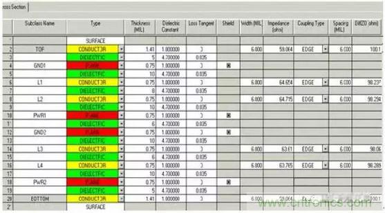 由上面的分析知道,PCB板的疊層設(shè)置和信號的耦合以及阻抗計算都有著密切的關(guān)系,所以在開始PCB設(shè)計之前必須進(jìn)行疊層設(shè)計,然后進(jìn)行信號的阻抗計算。在本設(shè)計中的疊層設(shè)計見下圖: