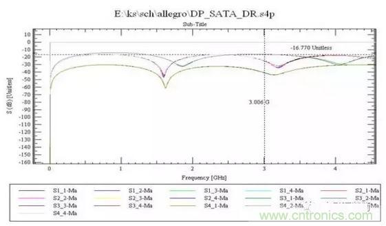 以上的相關(guān)步驟設(shè)置好以后就可以進(jìn)行仿真了,allegro可以進(jìn)行信號的反射仿真、串?dāng)_仿真,差分線還要進(jìn)行眼圖分析。當(dāng)然仿真也分前仿真和后仿真,在利用allegro進(jìn)行PCB設(shè)計的時候還需要結(jié)合仿真的結(jié)果實時的對設(shè)計進(jìn)行修改以達(dá)到符合要求的目的。由于仿真過程復(fù)雜,步驟繁瑣,在此不一一進(jìn)行描述, 差分對的布線有兩點(diǎn)要注意,一是兩條線的長度要盡量一樣長,等長是為了保證兩個差分信號時刻保持相反極性,減少共模分量。另一是兩線的間距(此間距由差分阻抗決定)要一直保持不變,也就是要保持平行。平行的方式有兩種,一為兩條線走在同一走線層(side-by-side),一為兩條線走在上下相鄰兩層(over-under)。一般以前者side-by-side 實現(xiàn)的方式較多。等距則主要是為了保證兩者差分阻抗一致,減少反射。對差分對的布線方式應(yīng)該要適當(dāng)?shù)目拷移叫小K^適當(dāng)?shù)目拷且驗檫@間距會影響到差分阻抗(differential impedance)的值, 此值是設(shè)計差分對的重要參數(shù)。需要平行也是因為要保持差分阻抗的一致性。若兩線忽遠(yuǎn)忽近, 差分阻抗就會不一致, 就會影響信號完整性(signal integrity)及時間延遲(timing delay)。從仿真的S參數(shù)曲線圖可以分析差分對的差分阻抗(differential impedance),以及信號完整性。下面給出本設(shè)計中的關(guān)鍵信號仿真波形以供加以說明。 從仿真圖例圖5看到,S11在0-3.0GHz 的頻域范圍內(nèi)其最劣化的指標(biāo)為:-16.770db以下 ,S22(粉紅色的曲線)也不劣于-17db。 這說明該差分對的差分阻抗(differential impedance)接近設(shè)計指標(biāo),信號完整性得到了保證。