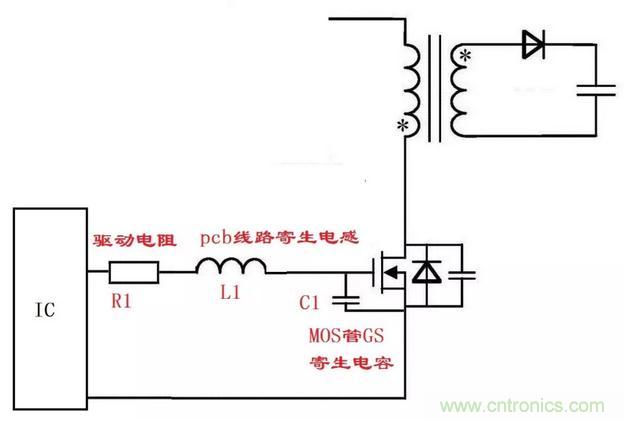 IC出來(lái)的波形正常,到C1兩端的波形就有振蕩了,實(shí)際上這個(gè)振蕩就是R1,L1和C1三個(gè)元器件的串聯(lián)振蕩引起的,R1為驅(qū)動(dòng)電阻,是我們外加的,L1是PCB上走線的寄生電感,C1是mos管gs的寄生電容。