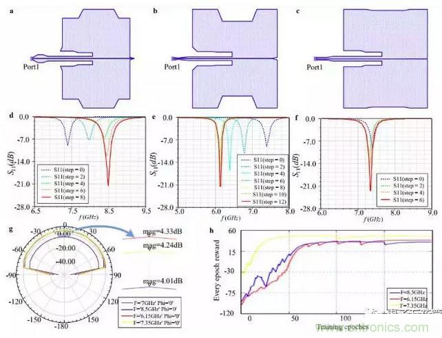 圖5:a-c)三種天線模型,其中心頻率分別為8.5GHz、6.15GHz 和7.35GHz,由智能體設(shè)計(jì)。d-f)觀察智能體根據(jù)回波損耗曲線(S11)的變化設(shè)計(jì)天線的過程。g)所有天線的增益模式。h)三種天線模型的學(xué)習(xí)曲線。
