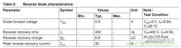 VSD,二極管正向壓降 ==>這個(gè)參數(shù)不是關(guān)注的重點(diǎn),trr,二極管反向回復(fù)時(shí)間 ==>越小越好,Qrr,反向恢復(fù)電荷 ==>Qrr大小關(guān)系到MOSFET的開關(guān)損耗,越小越好,trr越小此值也會(huì)小