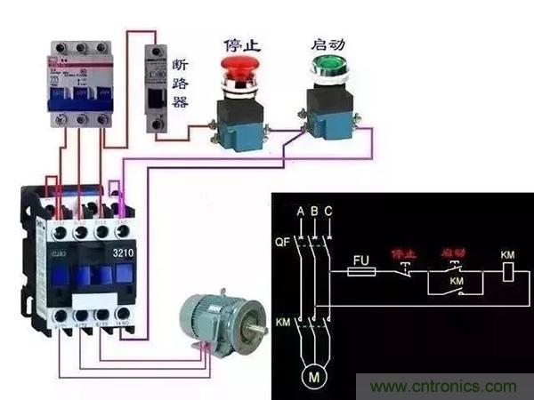 明白了實物接線以后我們再看電路圖就很容易理解了,右方是接觸器自鎖電路圖,ABC分別電表三相火線電源,QF開關,KM是接觸器,F(xiàn)U是熔斷器,KM帶個方口就是接觸器線圈電源,按鈕的位置,連在一起的是要接常閉,分開的是要接常開,圓圈M 是負載電動機,根據(jù)實物接線圖再結合自鎖電路圖!