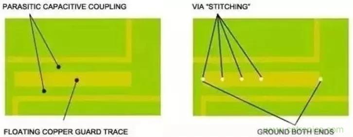 填充地也稱為保護線,通常將其用于電路中很難鋪設連續(xù)接地區(qū)域或需要屏蔽敏感電路的設計(圖8)。通過在引線兩端,或者是沿線放置接地過孔(即過孔陣列),增大屏蔽效應。請不要將保護線與設計用來提供返回電流通路的引線相混合,這樣的布局會引入串擾。