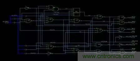 有了完整規(guī)畫后,接下來便是畫出平面的設(shè)計(jì)藍(lán)圖。在 IC 設(shè)計(jì)中,邏輯合成這個(gè)步驟便是將確定無誤的 HDL code,放入電子設(shè)計(jì)自動(dòng)化工具(EDA tool),讓電腦將 HDL code 轉(zhuǎn)換成邏輯電路,產(chǎn)生如下的電路圖。之后,反覆的確定此邏輯閘設(shè)計(jì)圖是否符合規(guī)格并修改,直到功能正確為止。