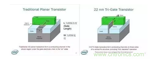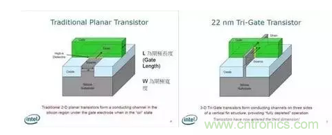 不過,制程并不能無限制的縮小,當(dāng)我們將電晶體縮小到 20 納米左右時(shí),就會(huì)遇到量子物理中的問題,讓電晶體有漏電的現(xiàn)象,抵銷縮小 L 時(shí)獲得的效益。作為改善方式,就是導(dǎo)入 FinFET(Tri-Gate)這個(gè)概念,如右上圖。在 Intel 以前所做的解釋中,可以知道藉由導(dǎo)入這個(gè)技術(shù),能減少因物理現(xiàn)象所導(dǎo)致的漏電現(xiàn)象。