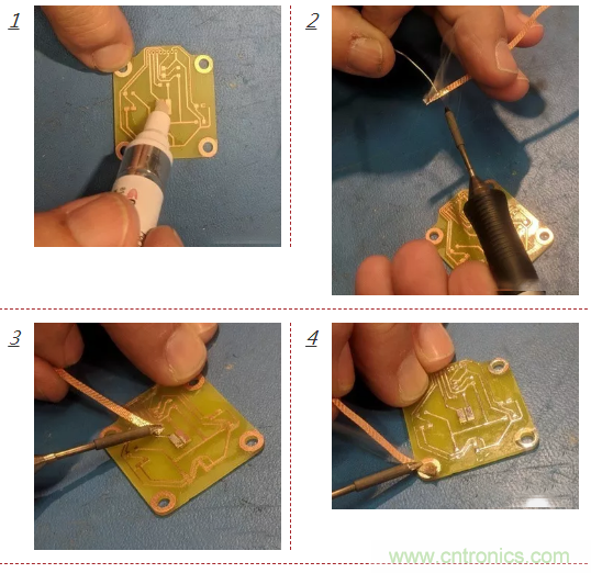 首先將焊料助焊劑涂在裸板上——請(qǐng)務(wù)必涂抹充足的劑量。然后在一條吸錫帶上鍍上一些焊料。如下圖所示,確保吸錫帶上有足夠的焊料。