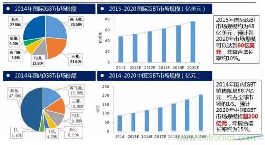 2015年國際IGBT市場規(guī)模約為48億美元,預(yù)計到2020年市場規(guī)模可以達到80億美元,年復(fù)合增長率約10%。2014年國內(nèi)IGBT銷售額是88.7億元,約占全球市場的1∕3。預(yù)計2020年中國IGBT市場規(guī)模將超200億元,年復(fù)合增長率約為15%。