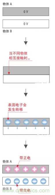 當兩個不同物體相互接觸時,表面電子就會發(fā)生轉移。獲得電子的一端帶負電,失去電子的一端帶正電。