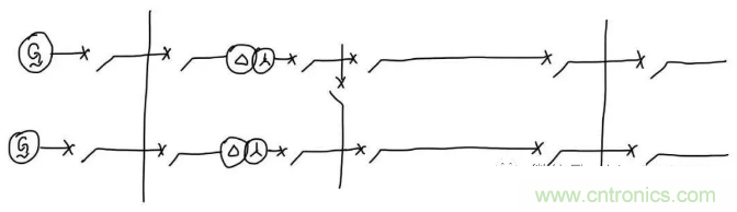 我們繼續(xù)往后看??梢钥吹桨l(fā)電機(jī)接到了低壓母線,對(duì)于這個(gè)低壓母線的保護(hù)來說,要做到故障時(shí)只停母線而不停其它設(shè)備,只要讓保護(hù)在故障時(shí)切除和母線直接連接的四個(gè)斷路器就可以了。所以四個(gè)斷路器旁邊的電流互感器圍成的范圍就是這條母線保護(hù)的保護(hù)范圍。