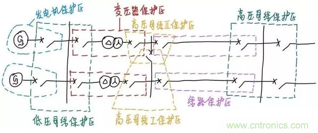 我們發(fā)現(xiàn)不同元件的保護(hù)區(qū)之間有重疊的部分。為了保證任何地方發(fā)生故障都在保護(hù)區(qū)內(nèi),這樣的重疊是必要的。如果沒有重疊區(qū),會(huì)導(dǎo)致保護(hù)出現(xiàn)盲區(qū),造成保護(hù)無法正確切除故障元件。但是我們希望重疊區(qū)盡可能小,因?yàn)橹丿B區(qū)內(nèi)的故障會(huì)造成兩個(gè)保護(hù)區(qū)內(nèi)所有的開關(guān)跳閘,擴(kuò)大停電范圍。