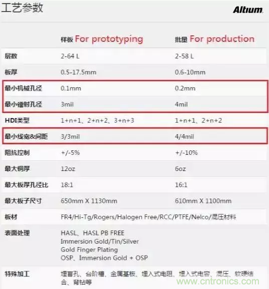 而對(duì)于制造精度相關(guān)的工藝要求來說,最基本最重要的是線寬線距和最小孔徑。也即加工廠能處理最小多細(xì)的線寬以及最小多大的孔。如果線寬在設(shè)計(jì)中沒有達(dá)到要求,太細(xì)的話是無法正確加工出來的。線寬線距精度同樣影響到絲印層上的文字圖案是否清晰。而孔徑太小的話也是沒有相應(yīng)的鉆頭支持的。最小孔徑所對(duì)應(yīng)的鉆頭尺寸同樣影響到機(jī)械孔,安裝孔等各種類型板形剪切的公差精度。