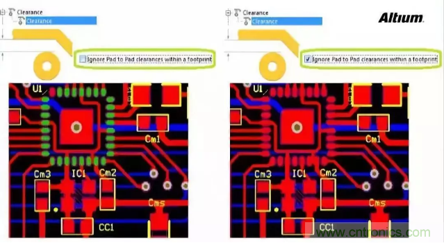 如果整個(gè)PCB的最小安全間距設(shè)置是8mil,那么元器件焊盤的間距明顯違反了規(guī)則設(shè)置。在規(guī)則檢查時(shí)或在線編輯時(shí)會(huì)一直綠色高亮來顯示違規(guī)。這種違規(guī)顯然是不需要處理的,我們應(yīng)該修正規(guī)則設(shè)置來消除綠色高亮顯示。在原來的處理辦法中,是用query語言單獨(dú)為這個(gè)器件定義不同的安全間距規(guī)則,并設(shè)置為高優(yōu)先級(jí)。在新的版本中,只需要簡(jiǎn)單的勾選選項(xiàng)即可解決這個(gè)問題,即忽略封裝內(nèi)的焊盤間距Ignore Pad to Pad clearance within a footprint。如下圖所示。